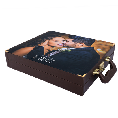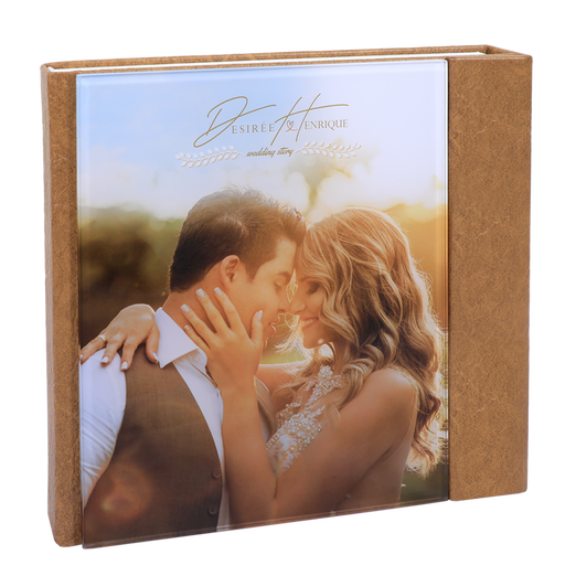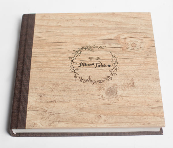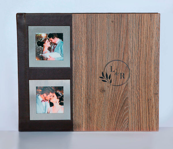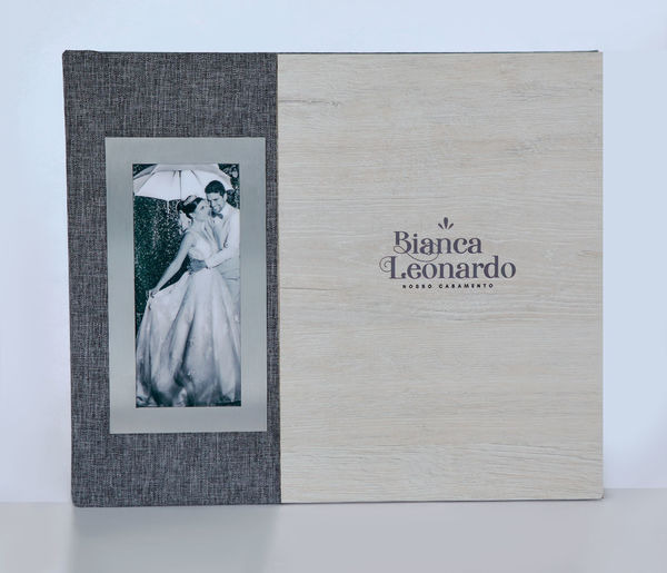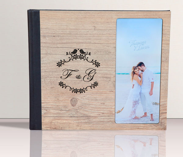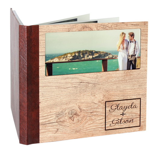 Capa em madeira com gravação a laser e janela fotográfica personalizada em acrílico.