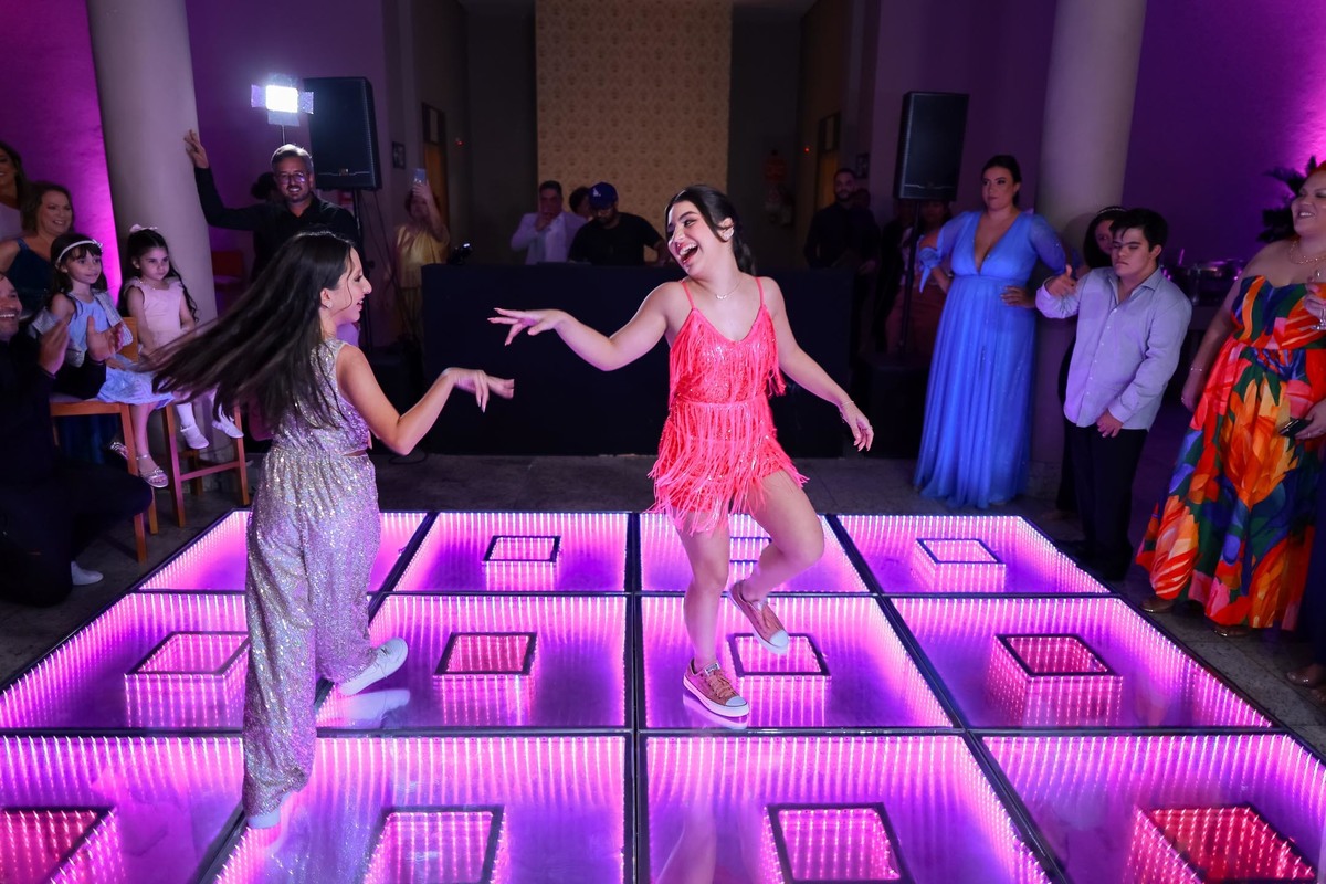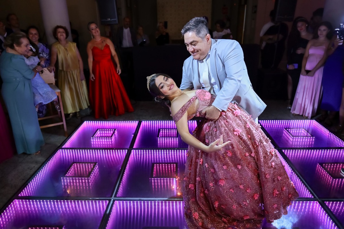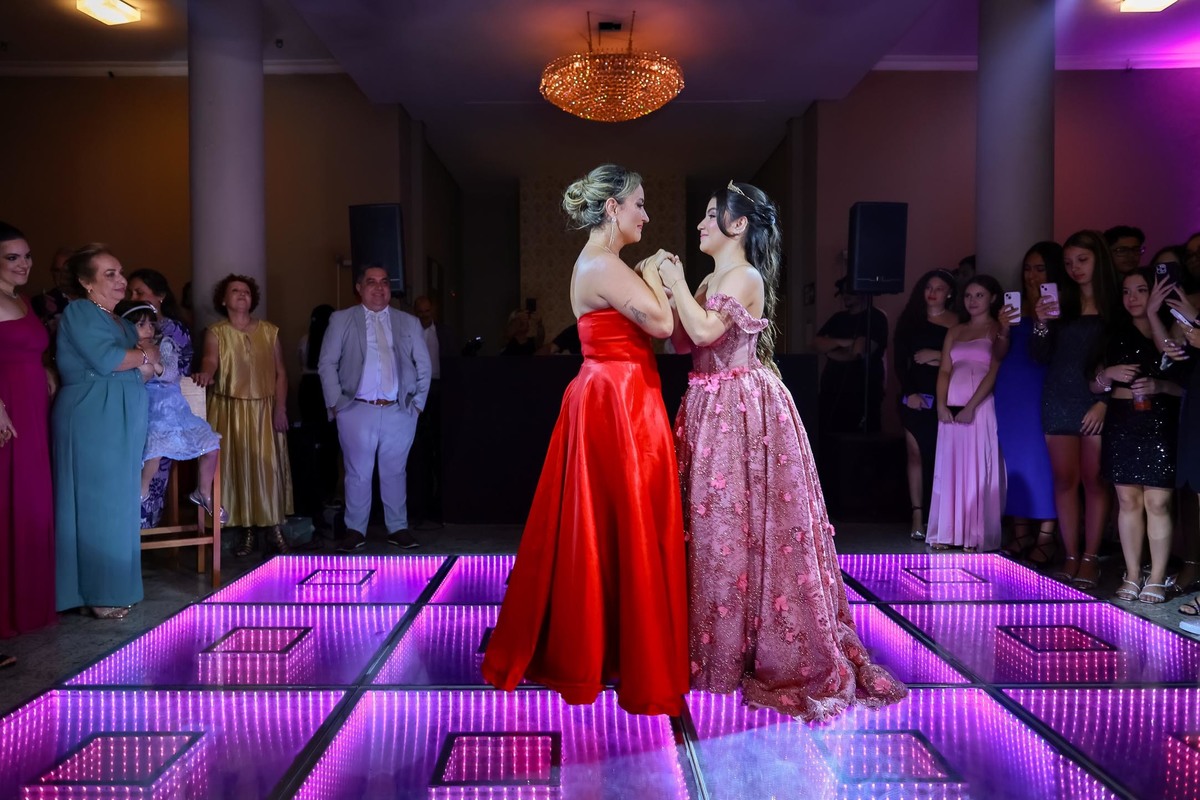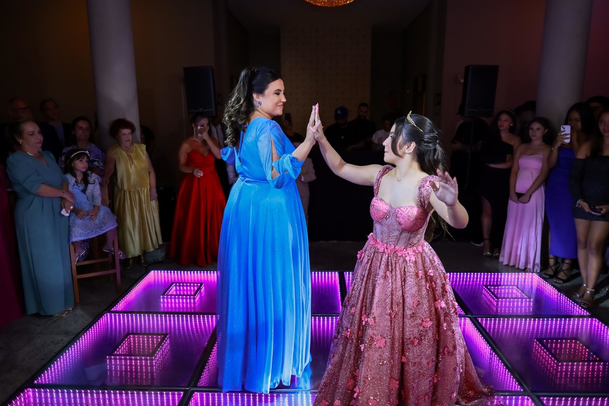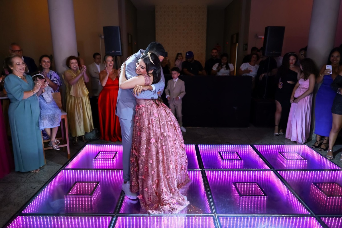 O ponto alto da noite foi o emocionante momento da valsa, que reuniu familiares e amigos em lágrimas, aplausos e muita alegria para celebrar essa nova fase da vida da Mary.
