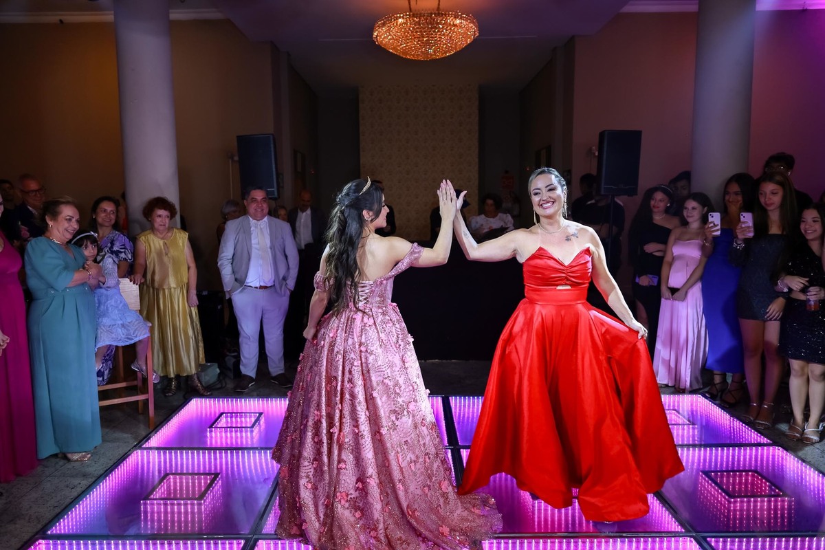 O ponto alto da noite foi o emocionante momento da valsa, que reuniu familiares e amigos em lágrimas, aplausos e muita alegria para celebrar essa nova fase da vida da Mary.