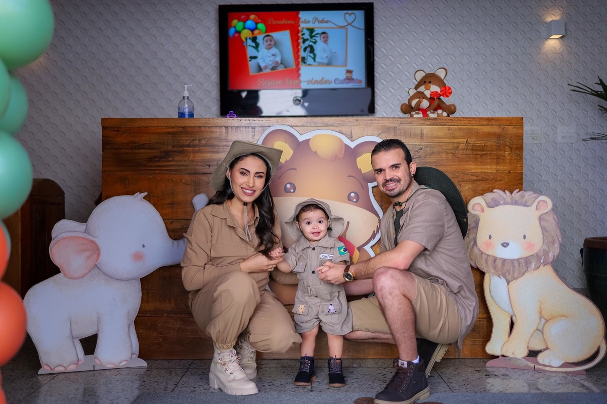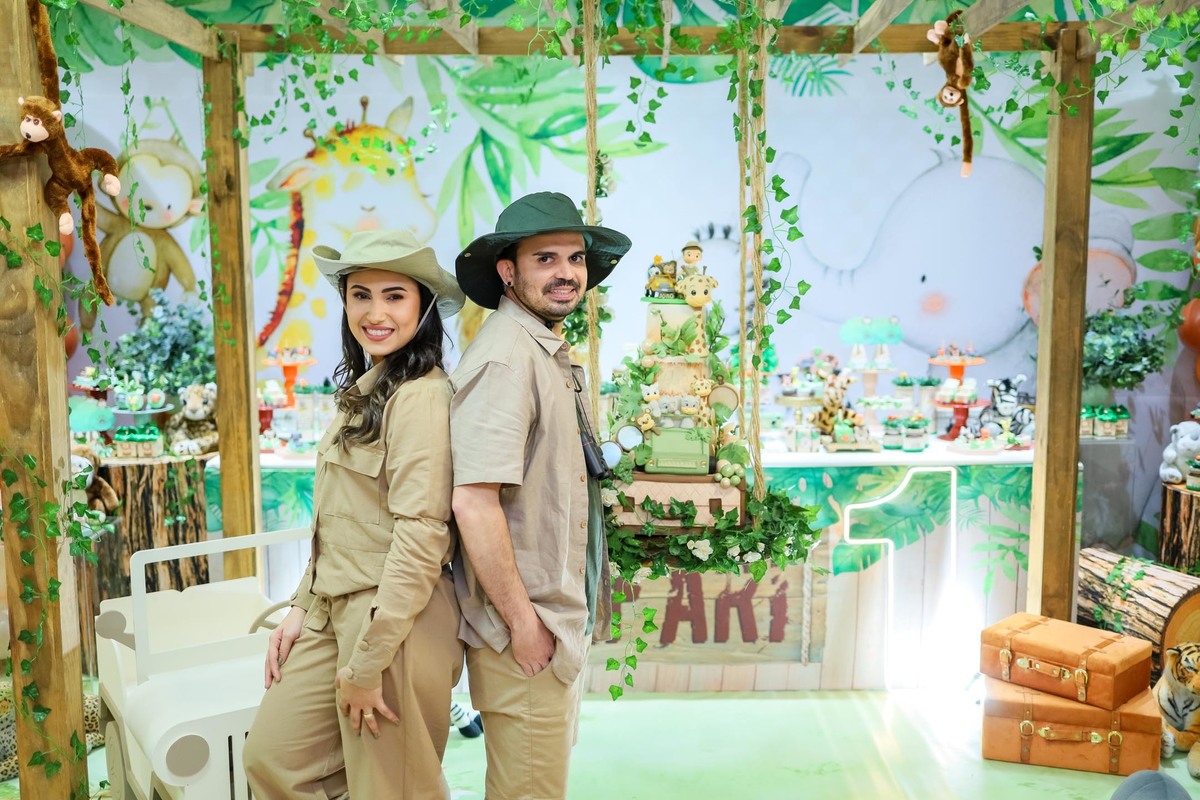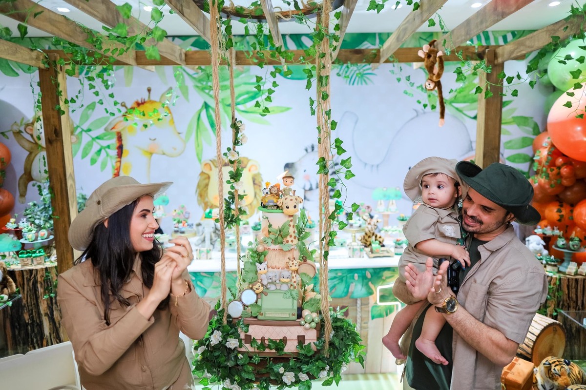 A mesa do bolo, com personalizados e doces temáticos, foi incrível, trazendo todo o charme e aventura do mundo selvagem para a festa. A noite foi repleta de diversão, com muitas brincadeiras para as crianças e a presença especial do mascote do buffet, o Urso Caramelo, que garantiu momentos de pura alegria a todos os convidados.