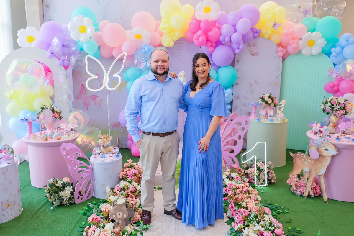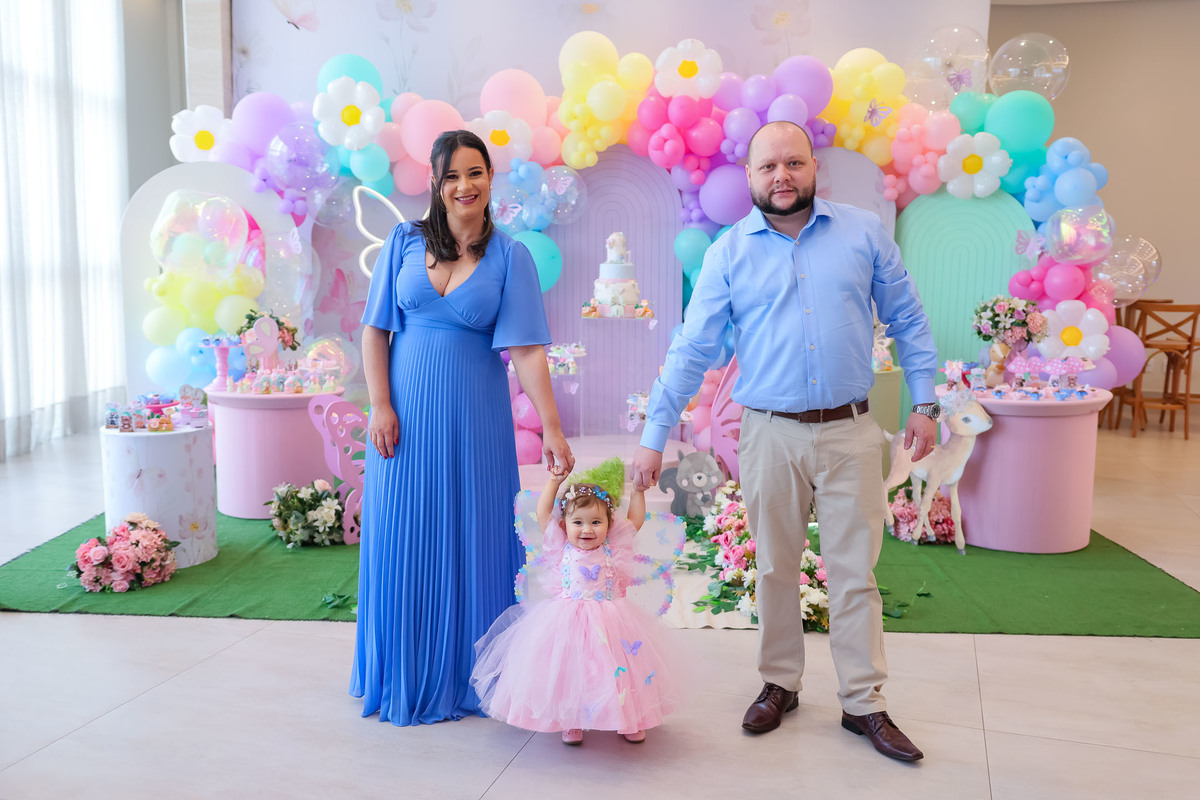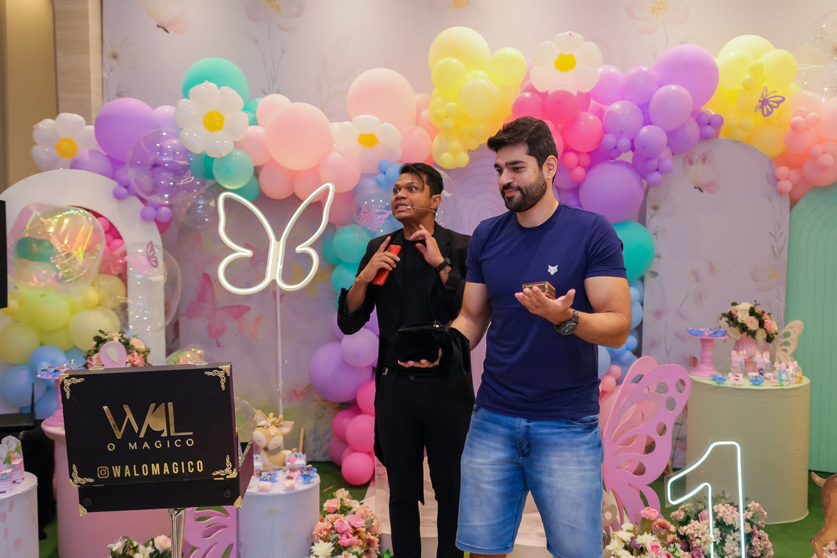 Comecei capturando todos os detalhes da mesa do bolo, que era uma verdadeira obra de arte, com personalizados do tema que destacavam o carinho e a atenção com que cada pedacinho da festa foi preparado. Cada detalhe das borboletas, das flores e dos elementos do jardim fica eternizado nas fotos para que a família guarde como lembrança desse momento único.