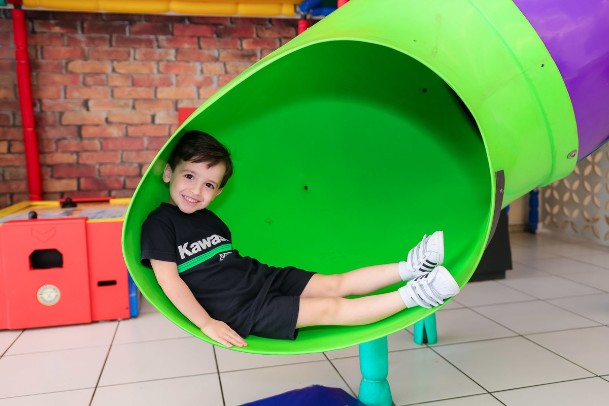 A mesa do bolo, decorada com miniaturas de motos e elementos temáticos, foi capturada em cada detalhe. Além disso, fotografei momentos especiais entre Joaquim e sua família, assim como as fotos espontâneas dele se divertindo com os amigos nos brinquedos.