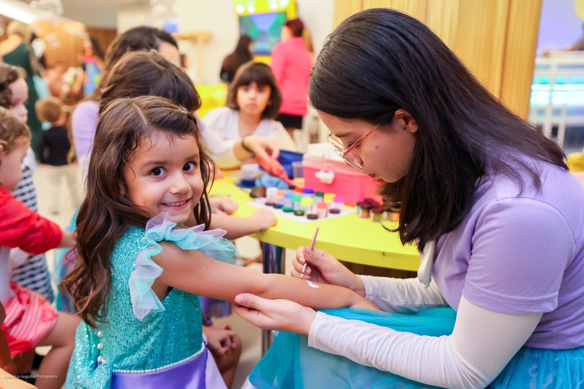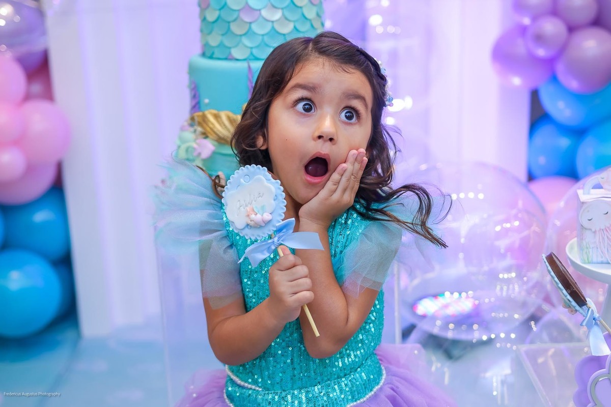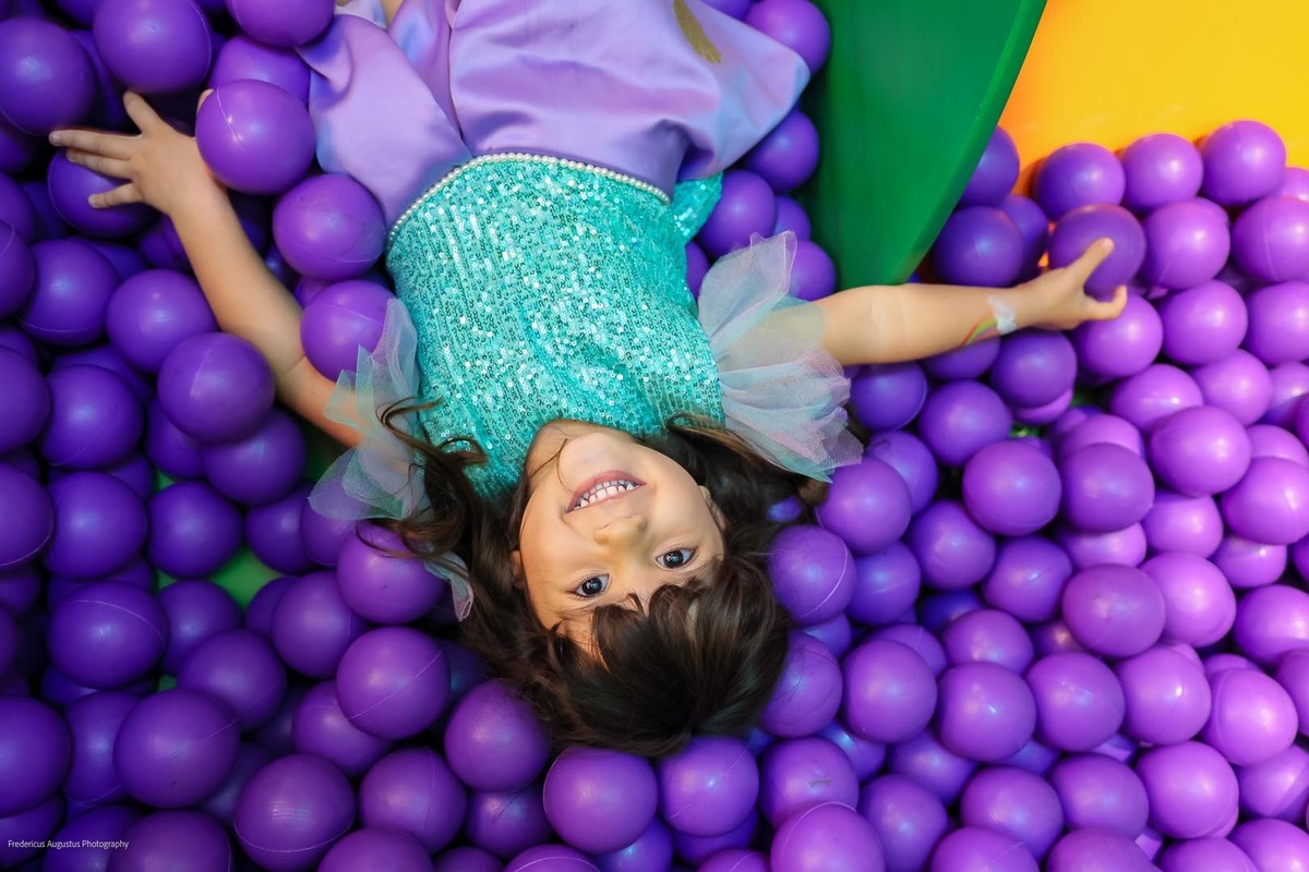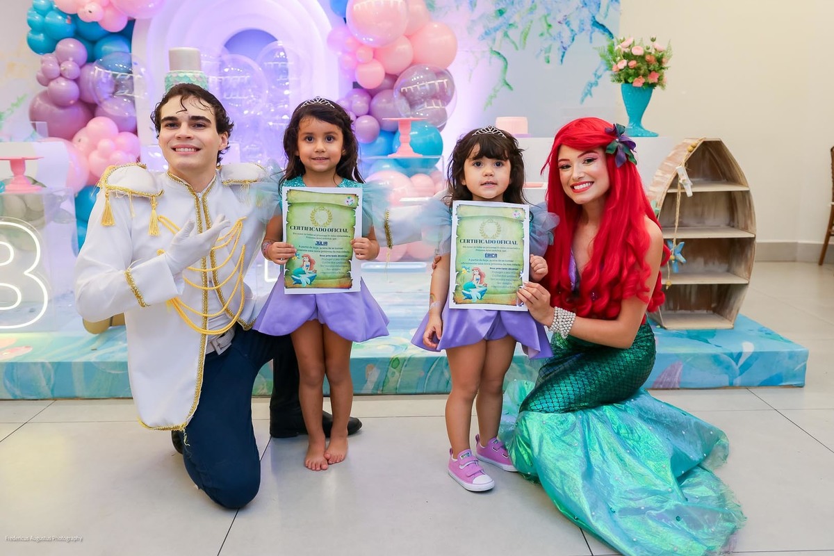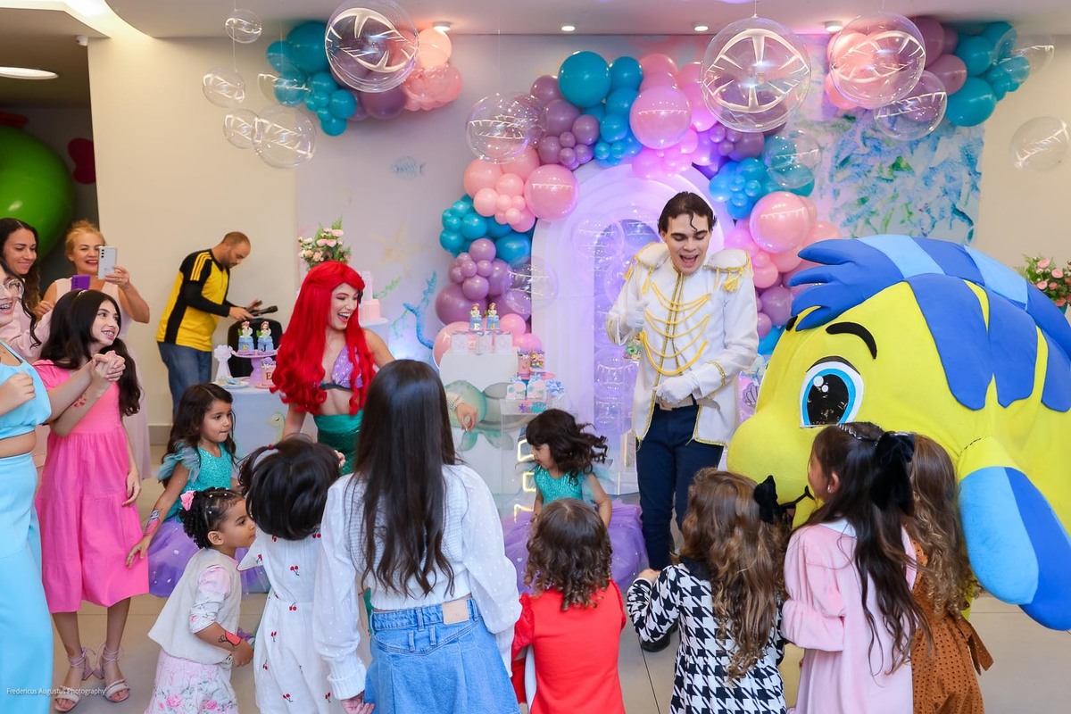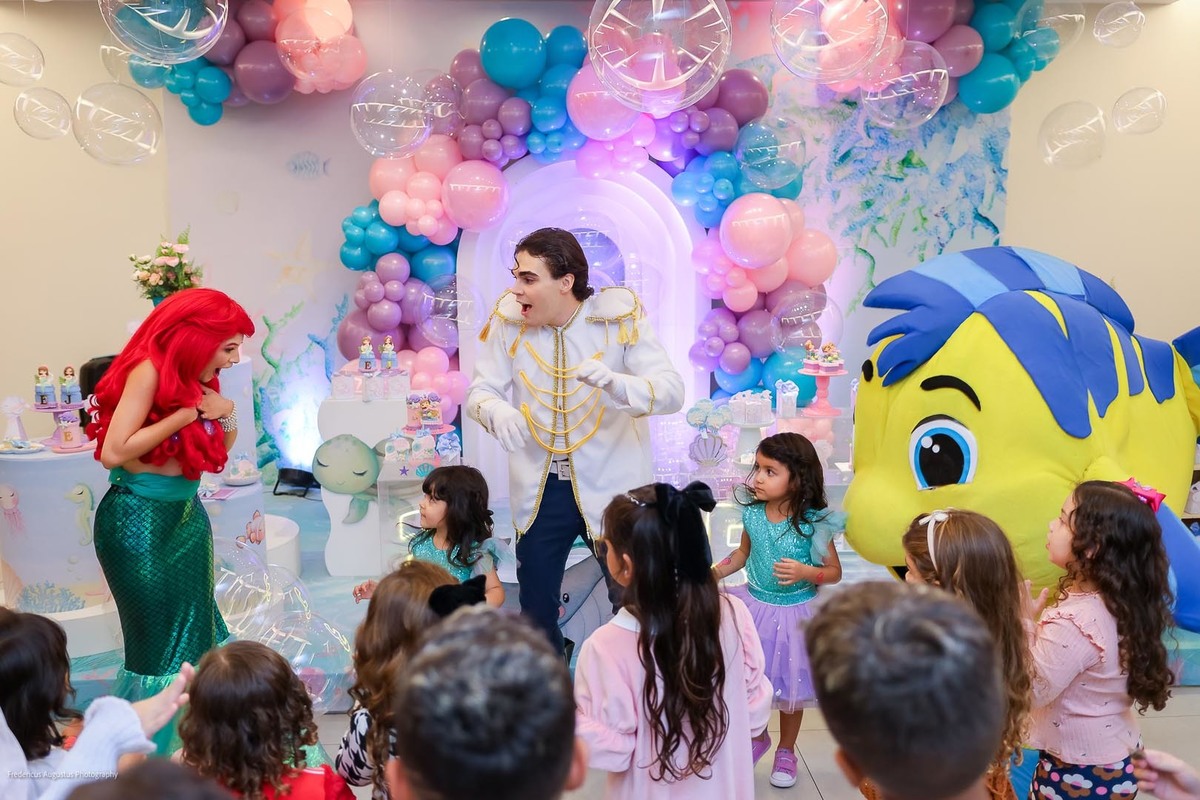 Um dos pontos altos da festa foi a apresentação dos personagens Ariel, Príncipe Eric e o divertido Linguado, que encantaram crianças e adultos com sua presença mágica. As pequenas exploraram cada canto do espaço e se divertiram muito nos brinquedos, encerrando tudo com um animado Parabéns, cheio de alegria e emoção.