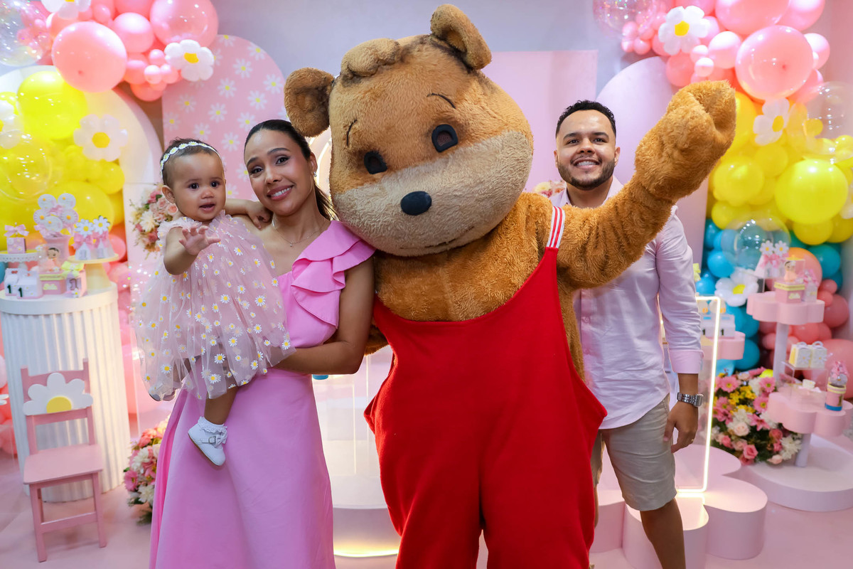Um dos pontos altos foi a presença sempre querida do Urso Caramelo, mascote do buffet, que arrancou abraços e sorrisos por onde passou. A criançada também amou a tirolesa e se reuniu com empolgação para cantar o Parabéns, numa explosão de alegria e amor pela pequena Stella.