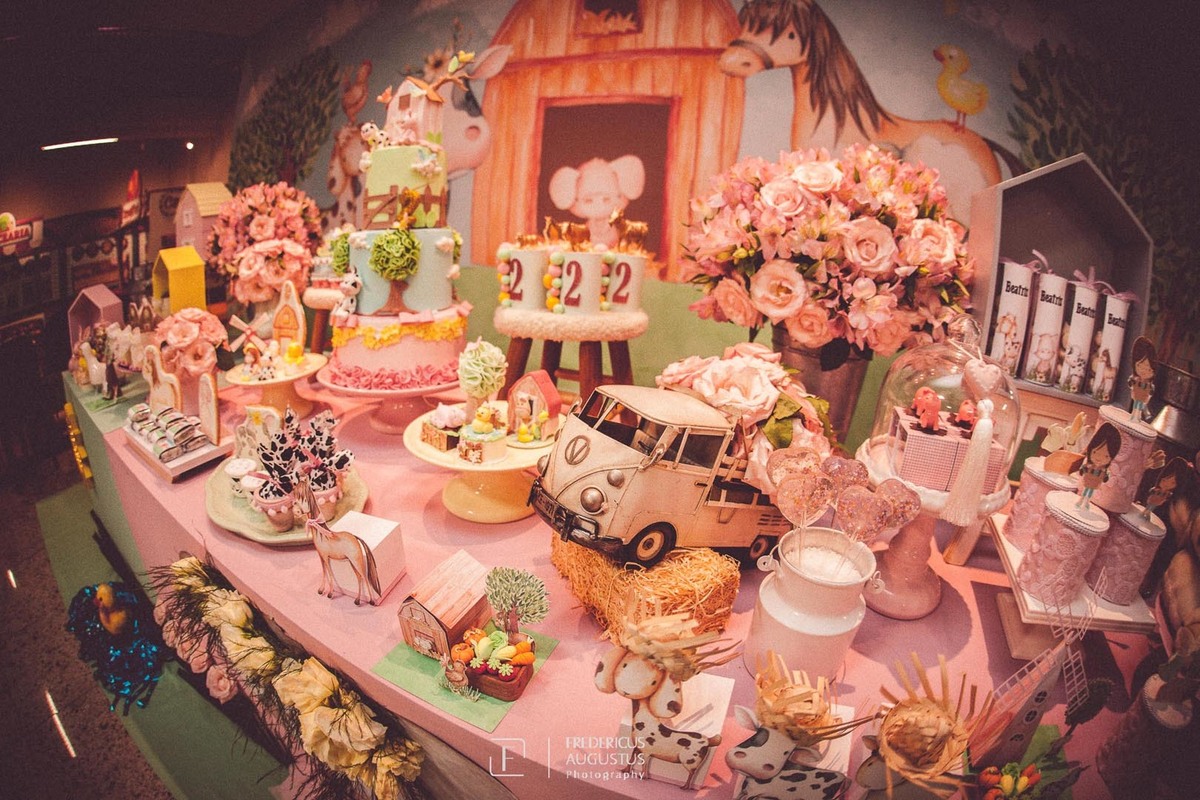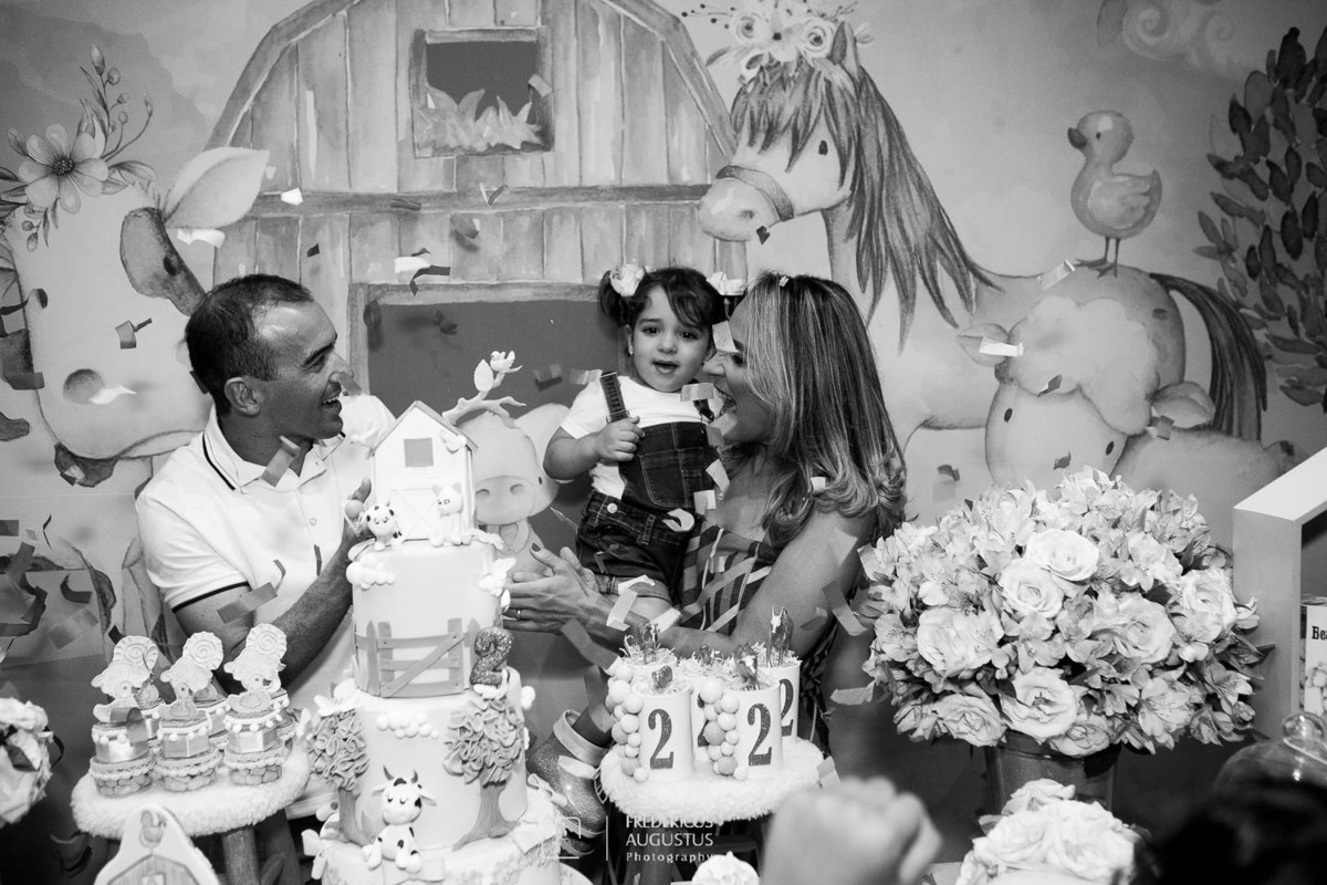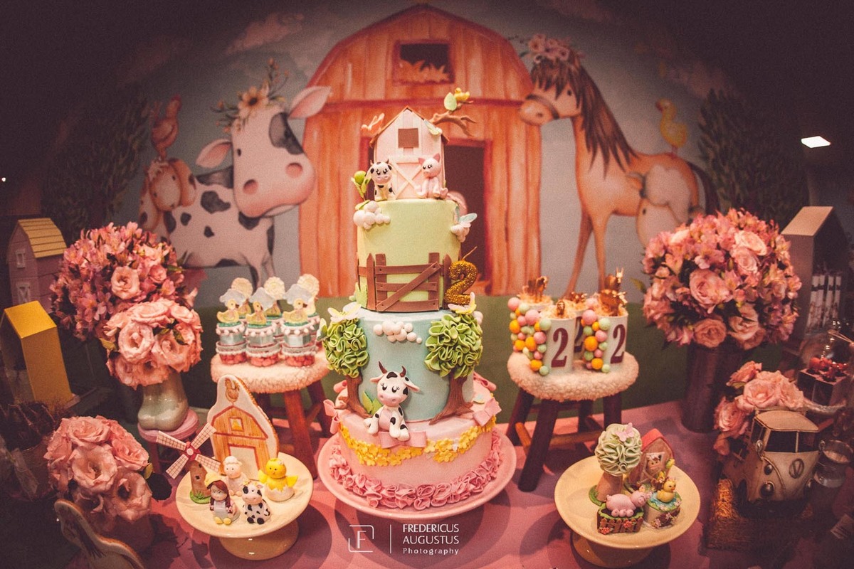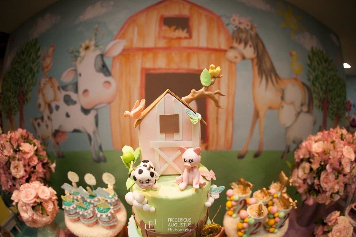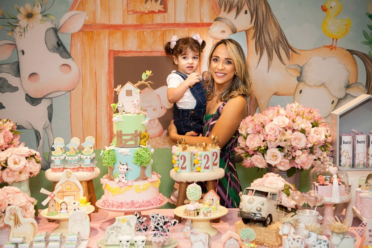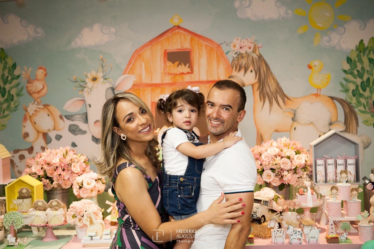 A linda decoração com cenário em 3D, tendo a mesa de bolo com os detalhes personalizados do tema de Fazendinha, encantou a aniversariante, Beatriz e seus pais Luciana e Felipe.