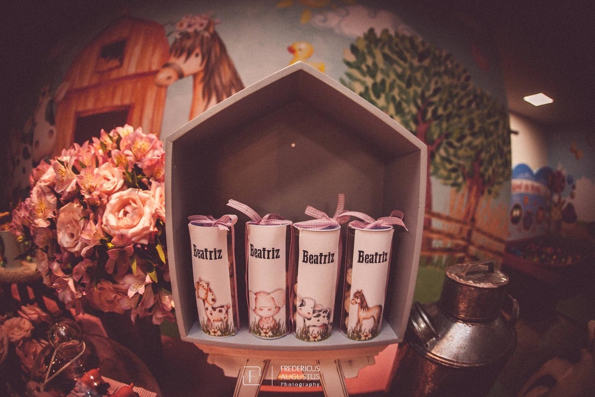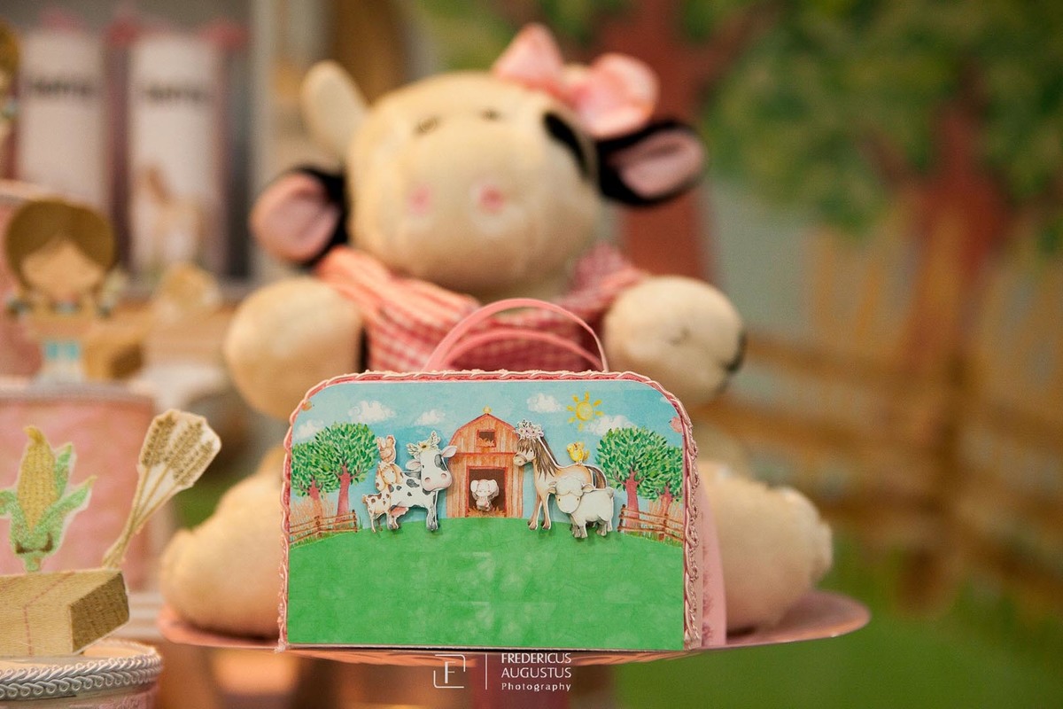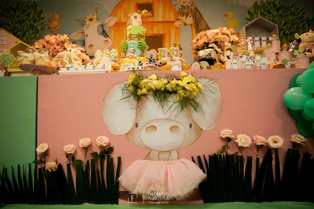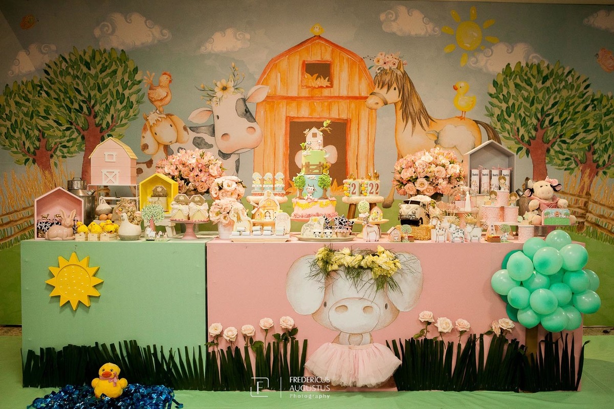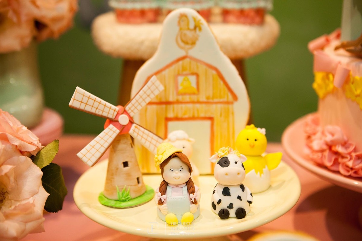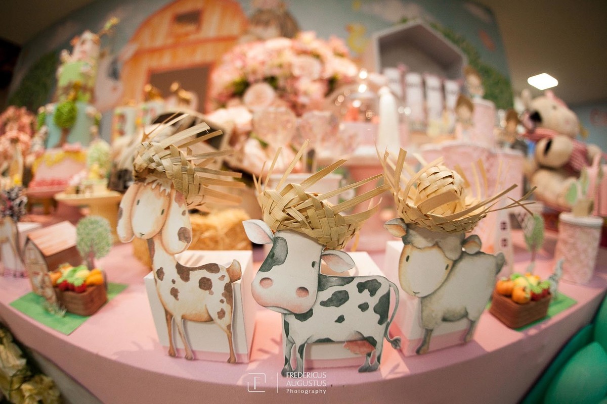 A linda decoração com cenário em 3D, tendo a mesa de bolo com os detalhes personalizados do tema de Fazendinha, encantou a aniversariante, Beatriz e seus pais Luciana e Felipe.